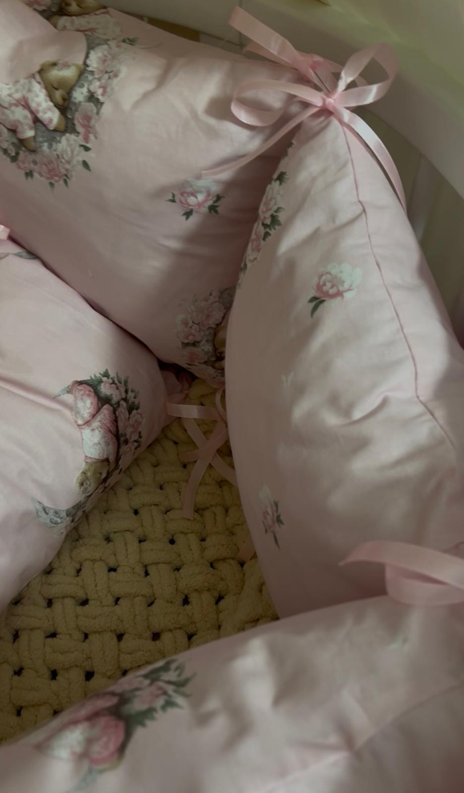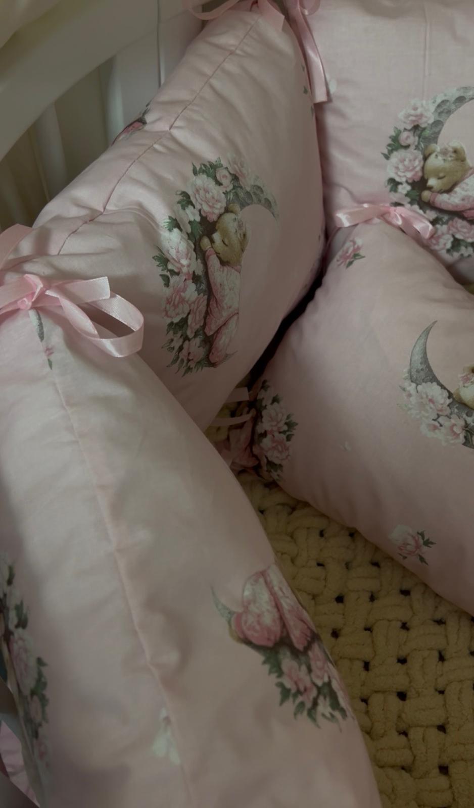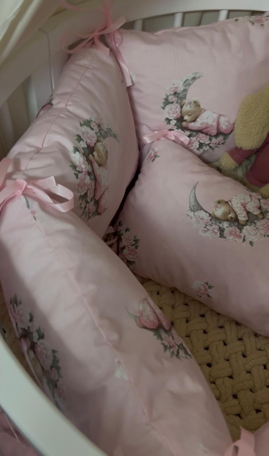 Ručně šitý mantinel do dětské postýlky z 10 samostatných dílů poskytuje miminku pocit bezpečí a zároveň jemně doplní vzhled dětského pokojíčku. Díky modulárnímu řešení lze jednotlivé části libovolně rozmístit po obvodu postýlky nebo použít jen část mantinelu podle potřeby.